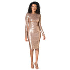 Stand out in this stunning sequined dress. Emery features long sleeves, a center back zipper, and a round boat neck with a low back. This is the perfect cocktail dress for a night out.