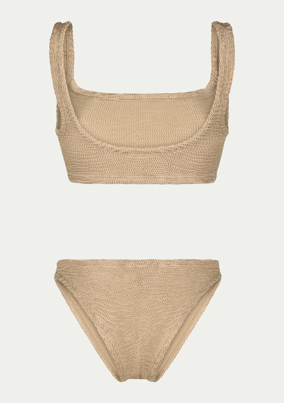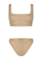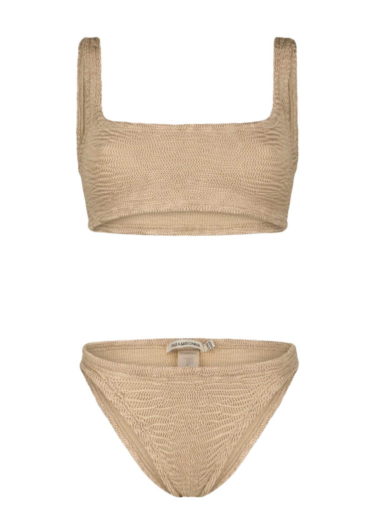 Two piece EMILY SUGAR by PARAMIDONNA. It fits through sizes from XS to 2XL. The swimsuit top is shaped like a sports bra with two straps as the bottom is low-waisted. To maintain the swimsuit’s high elasticity and bright color, please handwash it with soap and warm water. Do not tumble-dry, only air-dry.