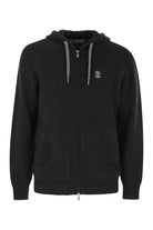 THIS GARMENT IS THE RESULT OF A COMBINATION OF TRADITIONAL WORKMANSHIP, SPORTY STYLE AND MODERN COMFORT, TO ENRICH MOMENTS OF RELAXATION AND LEISURE TIME WITH THE SOFT FEEL OF KNITWEAR. THE QUALITY OF THE CASHMERE FIBRES AND THE ENGLISH RIB WEAVE MAKE THIS KNIT IDEAL FOR THE SEASONS OF TRANSITION. THE DOUBLE-SLIDER ZIP FASTENING, RAGLAN-STYLE SLEEVES AND THE SOLOMEO LOGO ON THE CHEST COMPLETE THE CASUAL STYLE. - ZIP AND DOUBLE-SLIDER CLOSURE - LOW POCKETS - RAGLAN SLEEVE - ADJUSTABLE HOOD WITH DRAWSTRING - ENGLISH KNIT DESIGNER ID: M22704806G CZA06