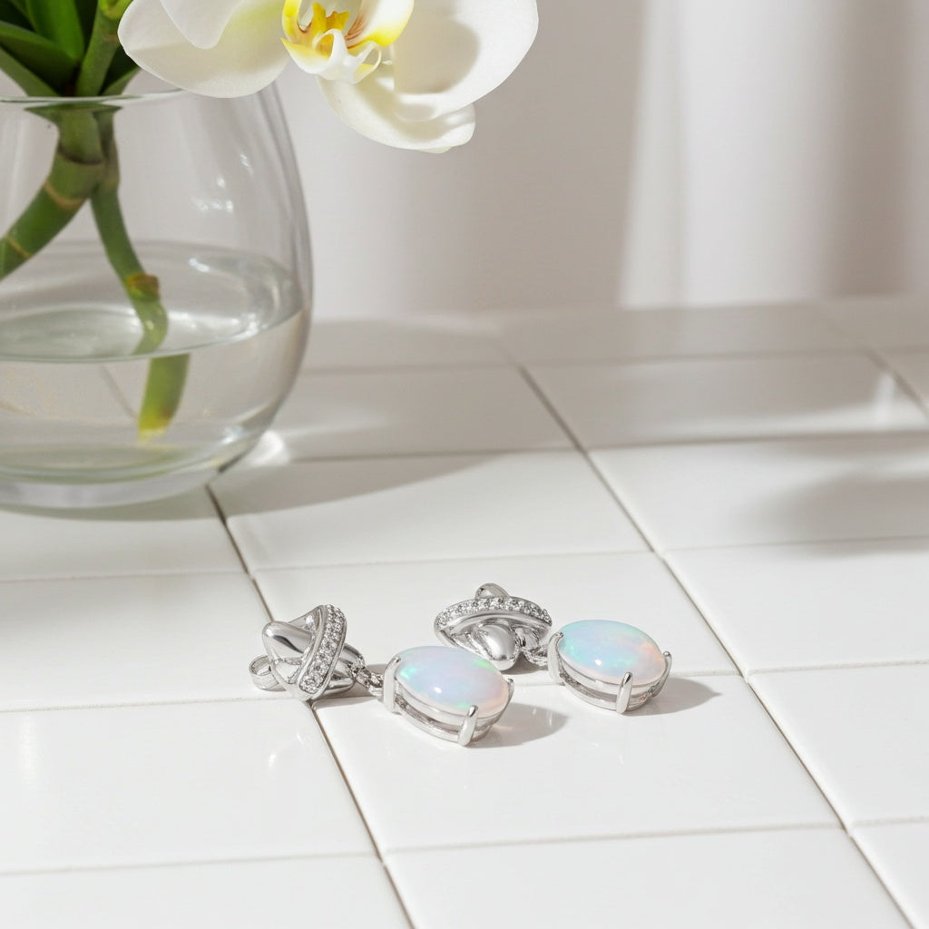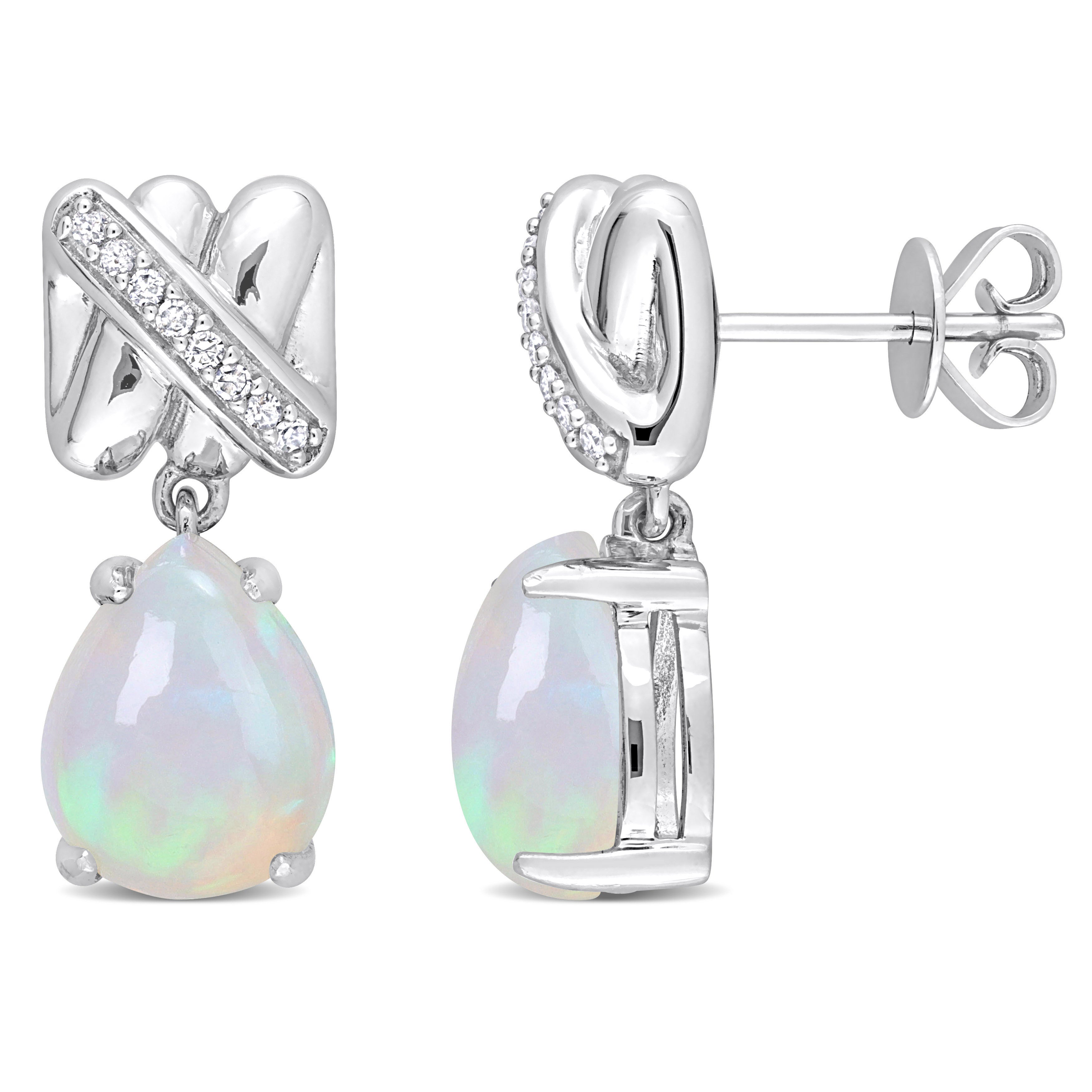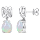 Ethiopian Blue Opal & Diamond Crossover Design Drop Earrings 14k White Gold