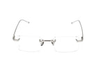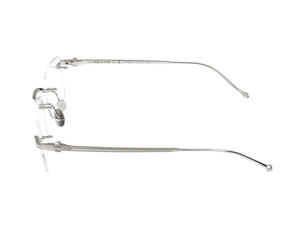 Elevate your everyday style with these sophisticated Cartier CT0619O eyeglasses in sleek silver with transparent lenses. These rimless optical frames feature a minimalist design that exudes luxury and refinement.
