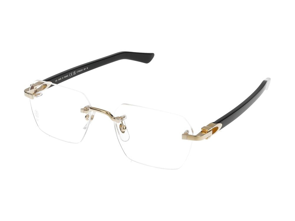 Elevate your everyday style with these sophisticated Cartier CT0623O eyeglasses in a stunning gold and black transparent finish. These rimless frames feature elegant gold-tone hardware and sleek black transparent temples, creating a refined and modern aesthetic.