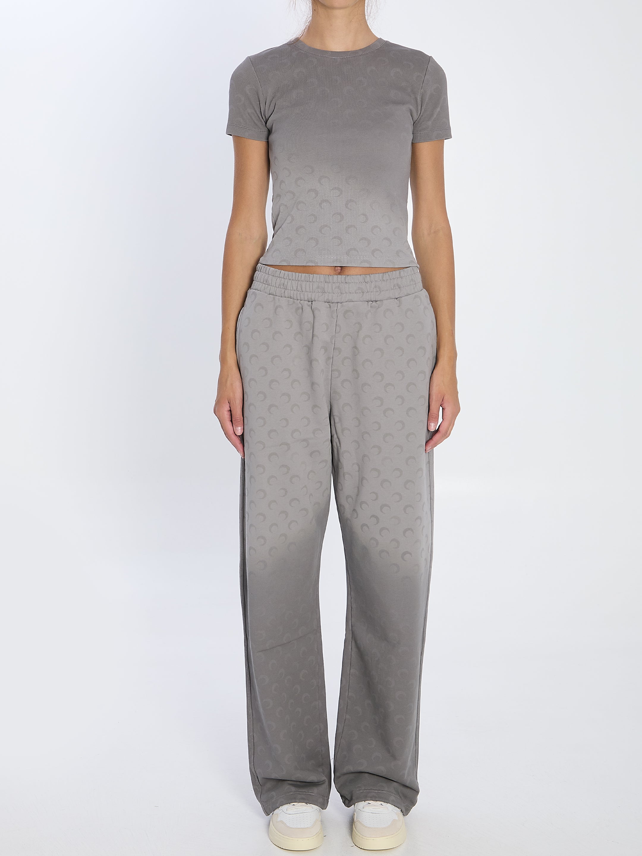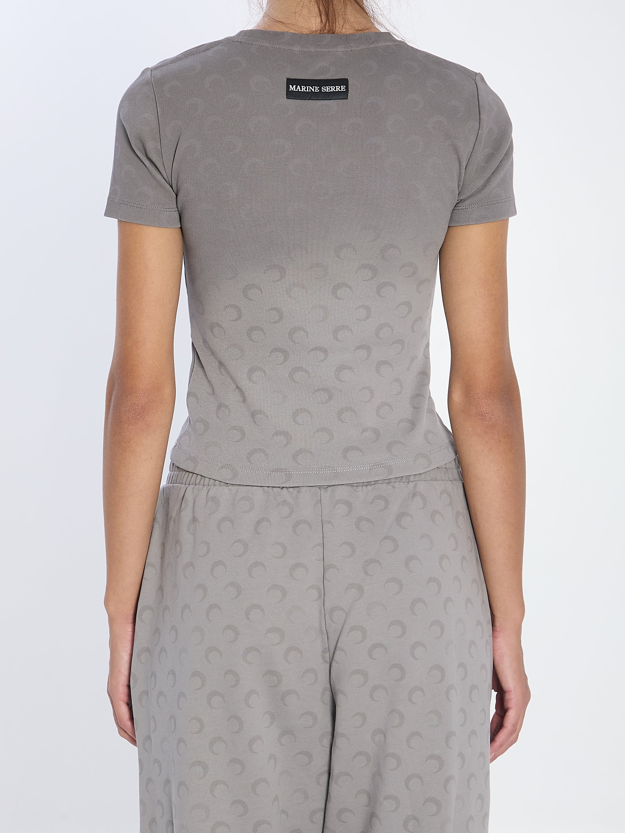 GREY COTTON JERSEY T-SHIRT. FEATURES AN ALL-OVER FADED MOON PRINT, RIBBED CREW NECKLINE, SHORT SLEEVES, AND A WOVEN LOGO LABEL UNDER THE BACK NECKLINE. CROPPED CUT. SLIM FIT.