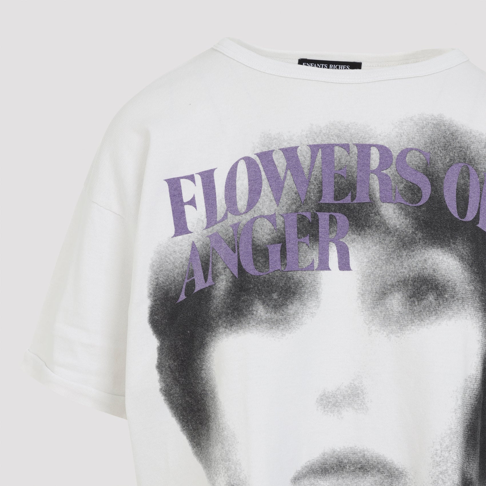 ENFANTS RICHES DÉPRIMÉS FADED WHITE COTTON FLOWER OF ANGER T-SHIRT. PURE FADED WHITE COTTON T-SHIRT, ROUND NECK, CHEST PURPLE LETTERING DESIGN, FRONT AND BACK BLACK DESIGN, SHORT SLEEVES, STRAIGHT HEM.