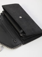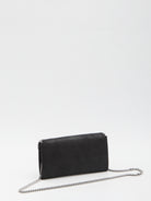 Falabella wallet-on-chain in black Shaggy Deer vegan fabric. Featuring chain strap with logo charm, snap-button closure, one flat bill compartment, eight card slots, and one zip pocket. Dust bag included.