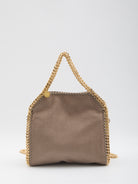 Falabella Mini tote bag in taupe-colored vegan Shaggy Deer fabric with gold diamond-cut chain. It features chain double handles, chain shoulder strap, snap button fastening, one main interior compartment and one interior slip pocket.