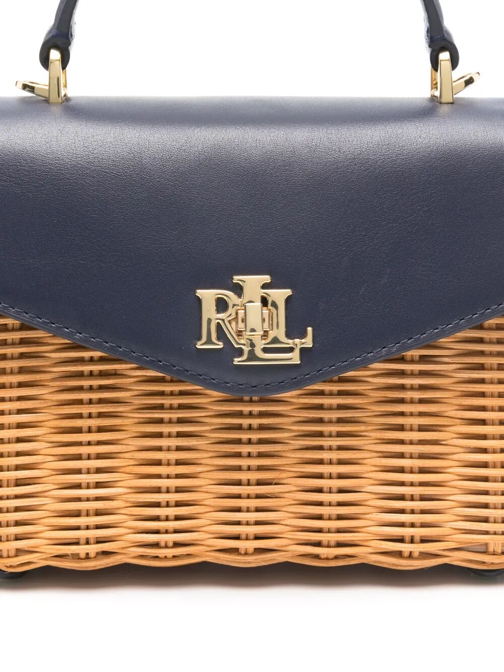 This charming satchel features a beautifully woven raffia body in warm honey tones, perfectly complemented by a sleek navy leather top flap adorned with the signature RL logo hardware. The structured silhouette and top handle make it ideal for both everyday wear and special occasions.