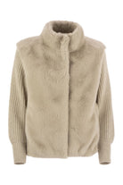 JACKET MADE OF FAUX FUR FABRIC WITH A CHARACTERISTIC SMOOTH SHAVED MINK EFFECT. IT IS CHARACTERISED BY A SOFT AND ENVELOPING TEXTURE TO THE TOUCH. A LUXURIOUS YET PRACTICAL GARMENT TO WEAR THANKS TO THE KNITTED SLEEVES WITH COB STITCH WORK. - REGULAR FIT - HIGH COLLAR - WOOL KNIT SLEEVES - COB STITCH WORKMANSHIP - FINENESS 5 - SIDE WELT POCKETS - COVERED BUTTON CLOSURE - LINED DESIGNER ID: GC00072DR12624 1985