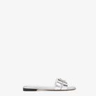 Introducing the Fendi FFOLD slide sandals, a luxurious addition to your warm-weather wardrobe. These elegant slides feature a sleek metallic silver finish with the iconic FF logo hardware adorning the upper strap, showcasing Fendi's signature craftsmanship and attention to detail.