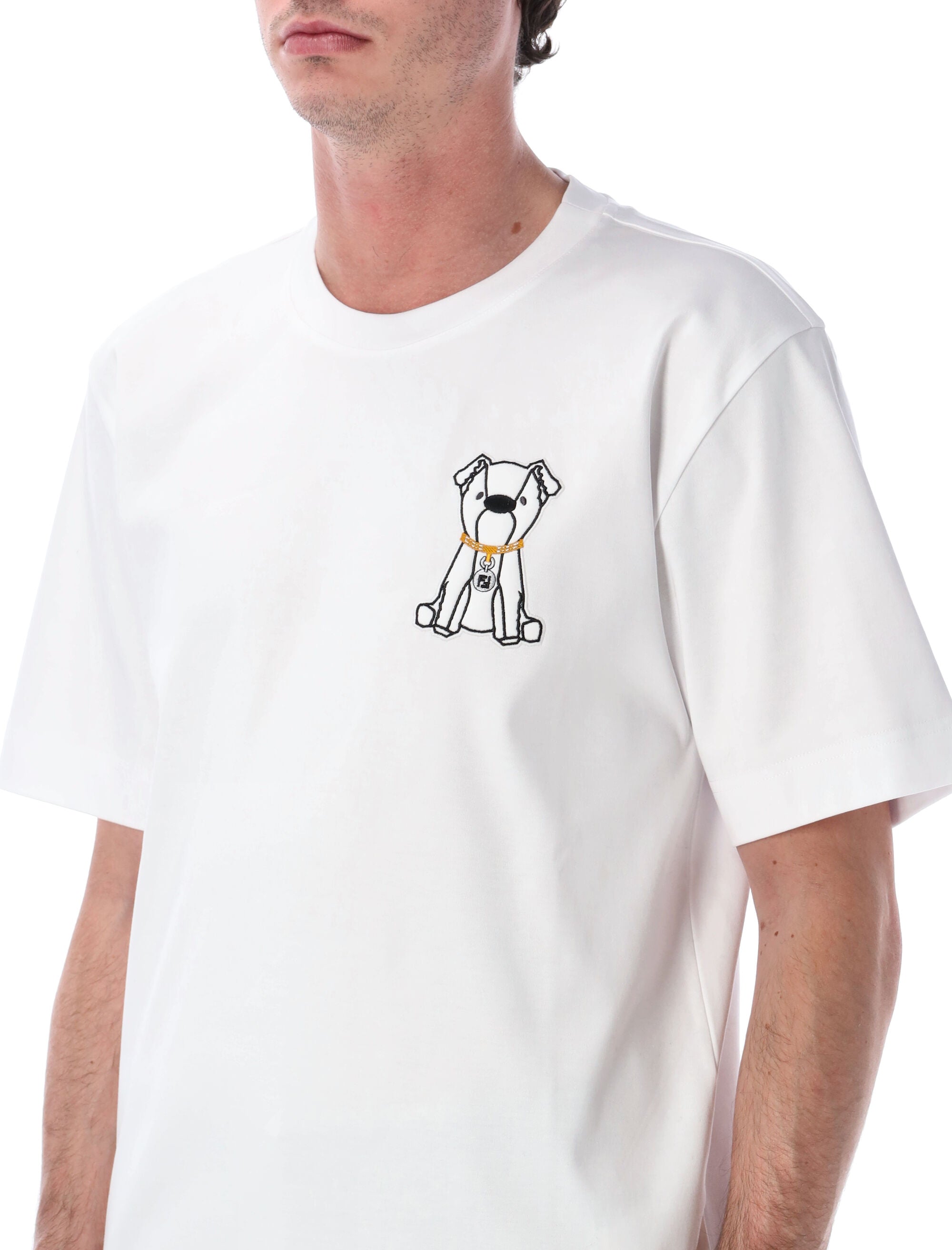 THIS FENDI T-SHIRT IN SOFT WHITE COTTON FEATURES A PLAYFUL EMBROIDERY OF ITO, THE DESIGNER’S DOG, ON THE CHEST. DESIGNED WITH A CLASSIC CREW NECKLINE AND SHORT SLEEVES, IT OFFERS A REGULAR FIT AND REFINED CASUAL ELEGANCE, PERFECT FOR LAYERING OR WEARING ALONE.