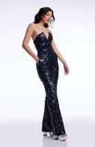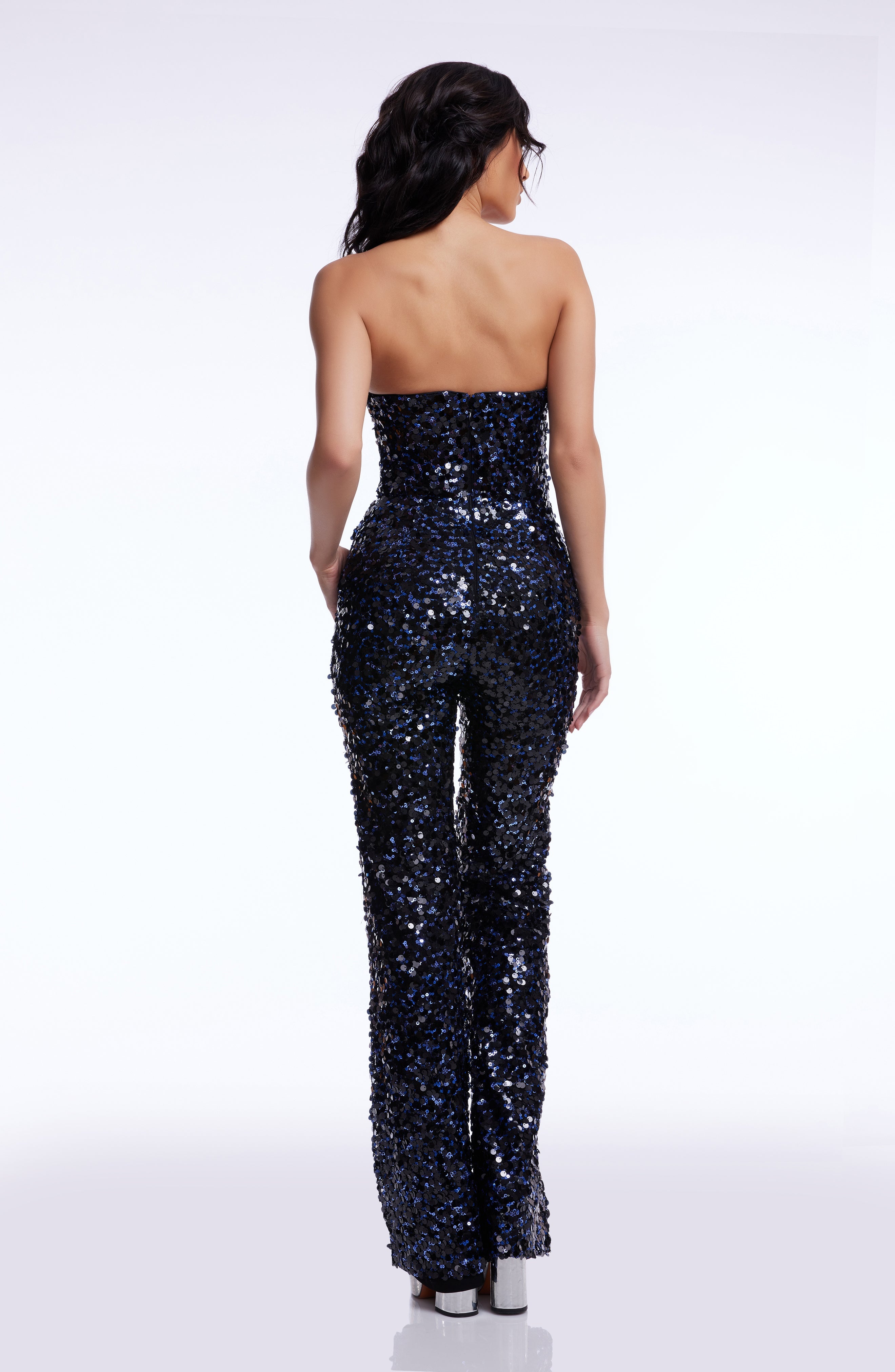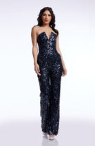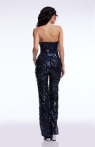 The Fernanda Jumpsuit features a chic strapless design, a flattering V-neck, and straight-leg pants for a sleek silhouette. Adorned with shimmering sequins, it adds a touch of glamour to any occasion. Perfect for a night out or a special event, this jumpsuit ensures you stand out in style.