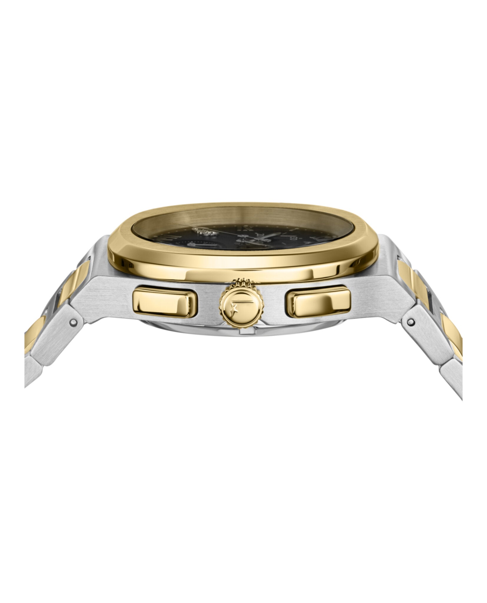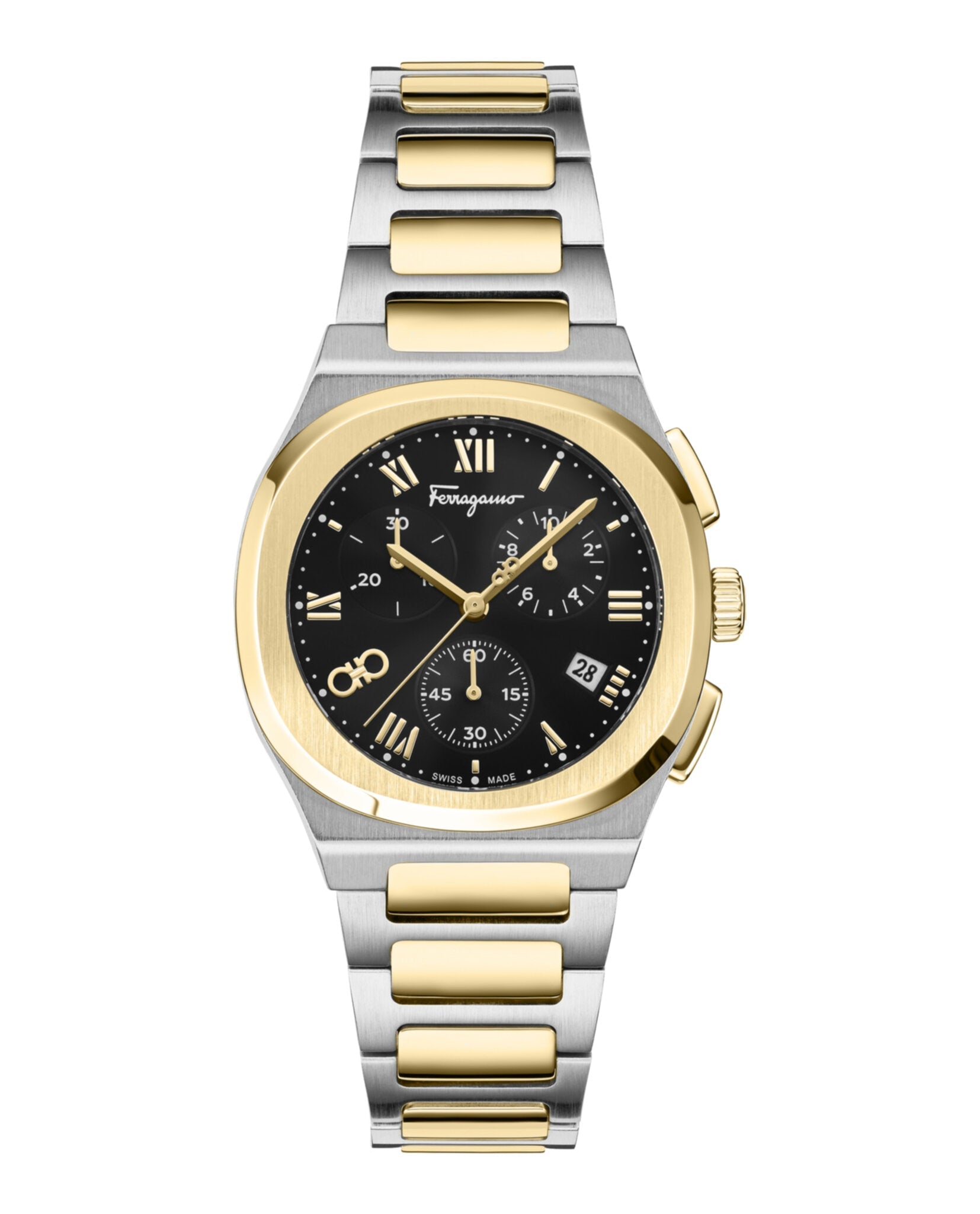 Elevate your wrist game with the Ferragamo Elliptical Chronograph Watch, a stunning timepiece that seamlessly blends Swiss precision with Italian luxury design. This sophisticated watch features a striking two-tone case and bracelet that effortlessly transitions from day to night, while the black sunray dial with Roman numerals adds timeless elegance to any ensemble.