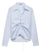 This distinctive piece features an innovative ruched gathering detail at the center front, transforming the classic button-down silhouette into a modern statement piece. The traditional shirt collar and long sleeves maintain a polished, professional aesthetic while the unique draping adds contemporary flair.