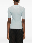 Elevate your everyday wardrobe with this exquisite fine-knit t-shirt from Chloé. Crafted from a luxurious blend of silk, merino wool, and viscose, this light blue piece features a flattering scoop neckline and comfortable short sleeves.
