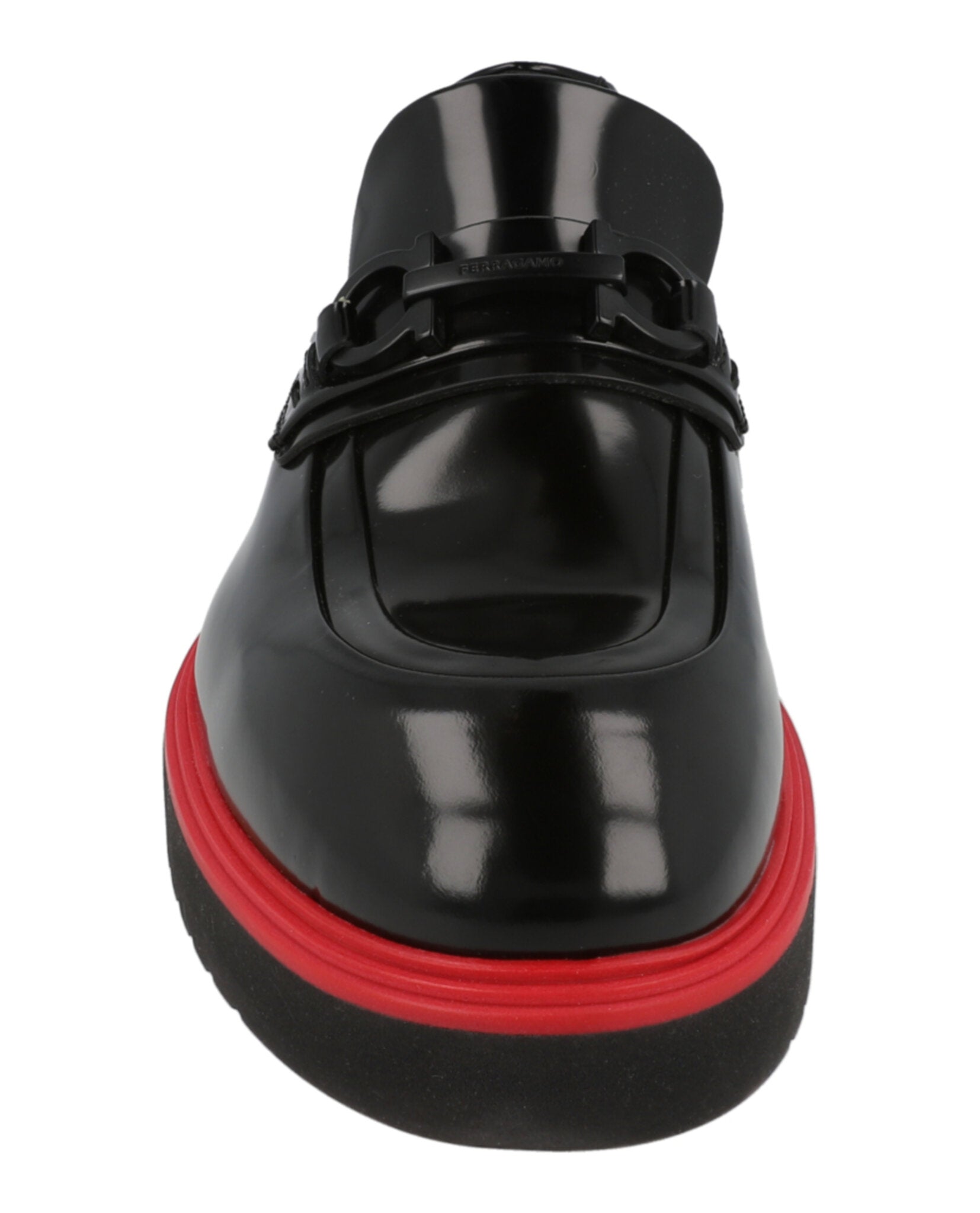 The modern silhouette boasts a 1.5" block heel and 1" platform for comfortable all-day wear, while the round toe and contrasting red trim create a striking visual impact. The glossy patent finish and tonal logo accents make these loafers perfect for transitioning from office meetings to evening outings.