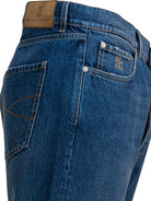 Brunello Cucinelli five-pocket jeans with a pure cotton denim construction. The model features a silhouette with a slightly high waist that runs smoothly down the leg. Five-pocket structure features front pockets with breast pocket and back patch pockets. Features a metal button closure. The iconic fit defines the volumes and conformation of the garment.