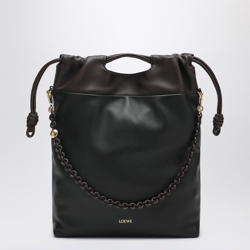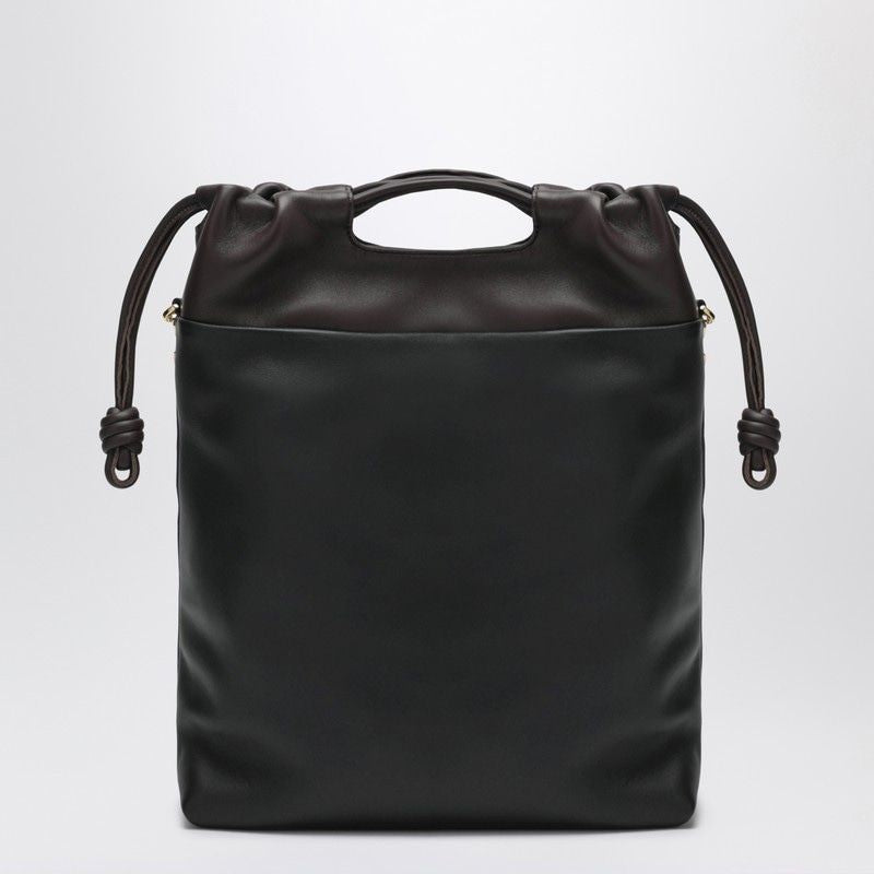 TOTE BAG IN SOFT BICOLOR BLACK AND DARK CHESTNUT LAMBSKIN, FEATURING VERTICAL SILHOUETTE, KNOTTED DRAWSTRING, TONE-ON-TONE DONUT CHAIN WITH ANAGRAM PEBBLE AT THE TOP, TOP HANDLES, ADJUSTABLE AND REMOVABLE LEATHER SHOULDER STRAP, MAGNETIC CLOSURE, SUEDE LINING, AND EMBOSSED LOGO LETTERING ON THE FRONT.