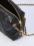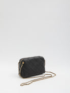 Black quilted soft nappa leather bag. It features a leather-woven chain shoulder strap, a zip closure, a metal logo zipper pull, one main compartment with an internal flat pocket, and a fabric lining. Dustbag included. Any imperfections in the leather should not be considered manufacturing defects, but rather a characteristic of the material.