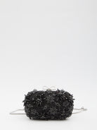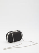 Black satin clutch embellished with floral crystals. Features a removable chain shoulder strap, silver crystal bow detail, clasp closure, and a main compartment with a flat pocket. Dust bag included.