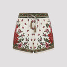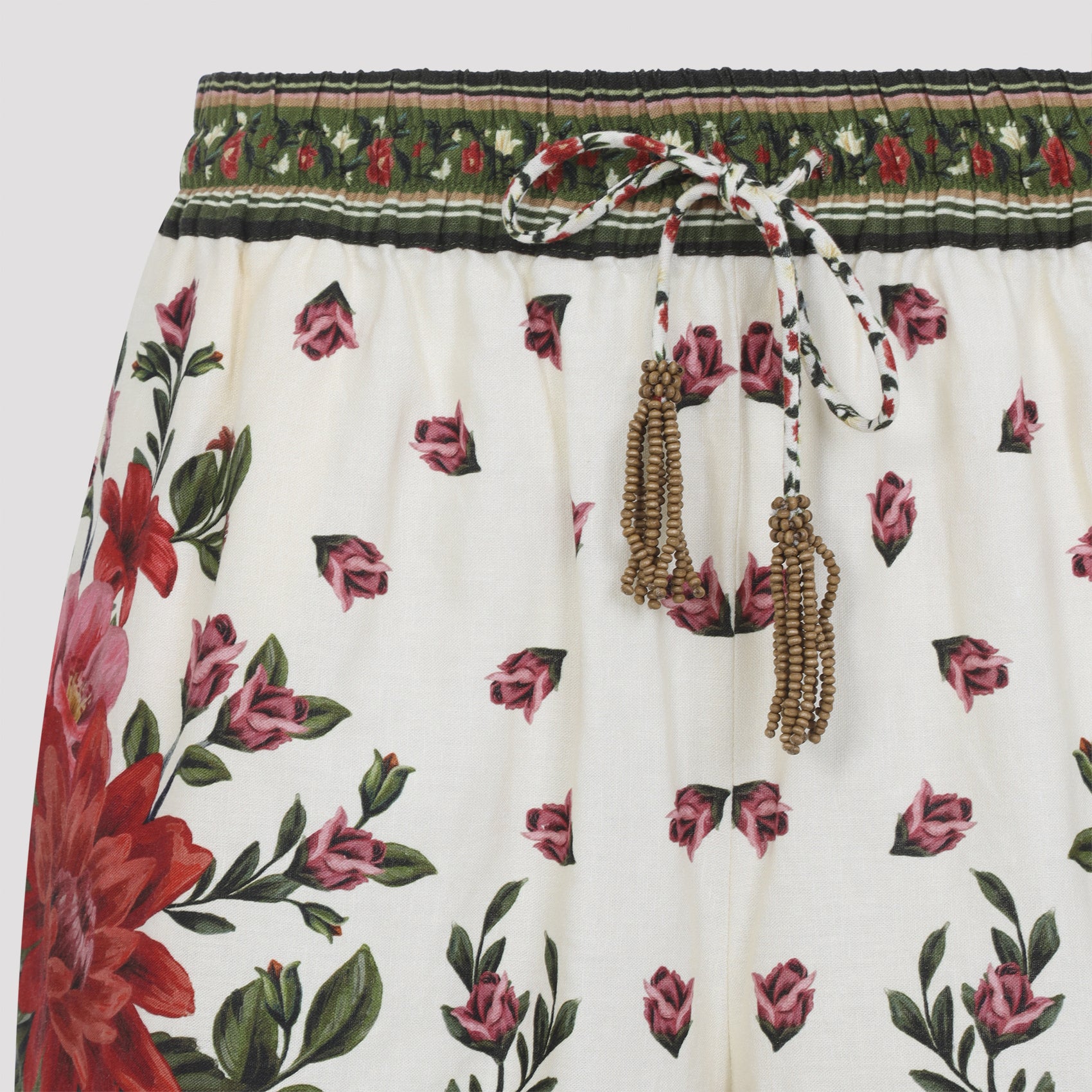 FARM RIO FLORAL PAULA BLACK LINEN WONDER SAND SHORT. CRAFTED IN LINEN AND VISCOSE BLEND. ELASTIC WAISTBAND, FRONT DRAWSTRING DETAILS, STRAIGHT HEM. WHITE BACKGROUND, MULTICOLOR FLORAL DESIGN ALL-OVER.