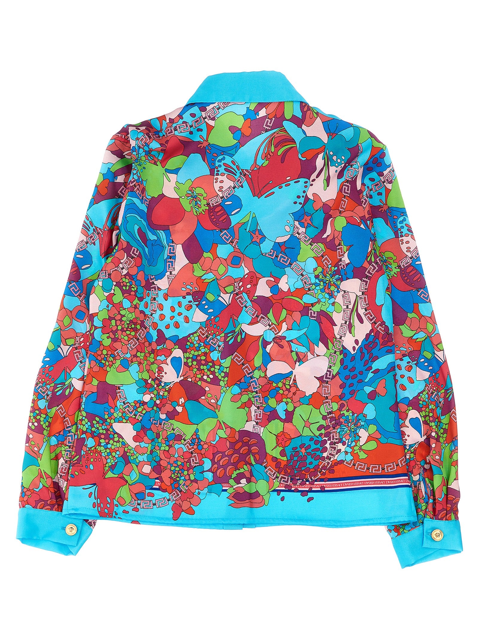 Make a bold statement with this luxurious VERSACE KIDS satin shirt featuring an eye-catching floral print in vibrant colors.