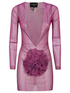 FUCHSIA SHORT DRESS, LONG SLEEVES, LARGE FLOWER AS A DECORATION IN FRONT, LARGE V -NECK, FRONT SLIT.