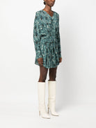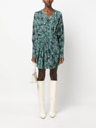 FONTANA PRINTED SHORT DRESS FROM IRO FEATURING GREEN, ABSTRACT PATTERN PRINT, DRAPED DETAILING, SCOOP NECK, LONG SLEEVES, CONCEALED SIDE FASTENING AND REAR CURVED HEM.