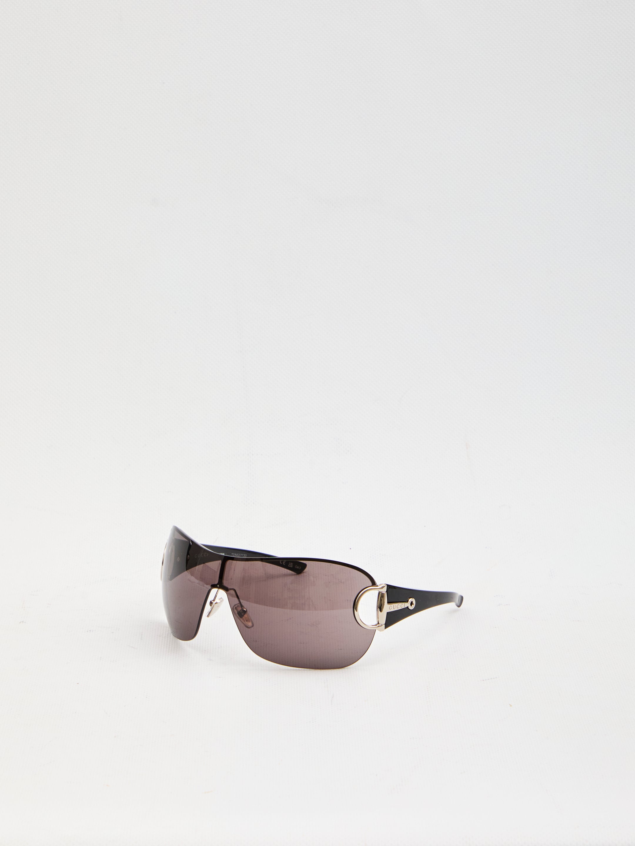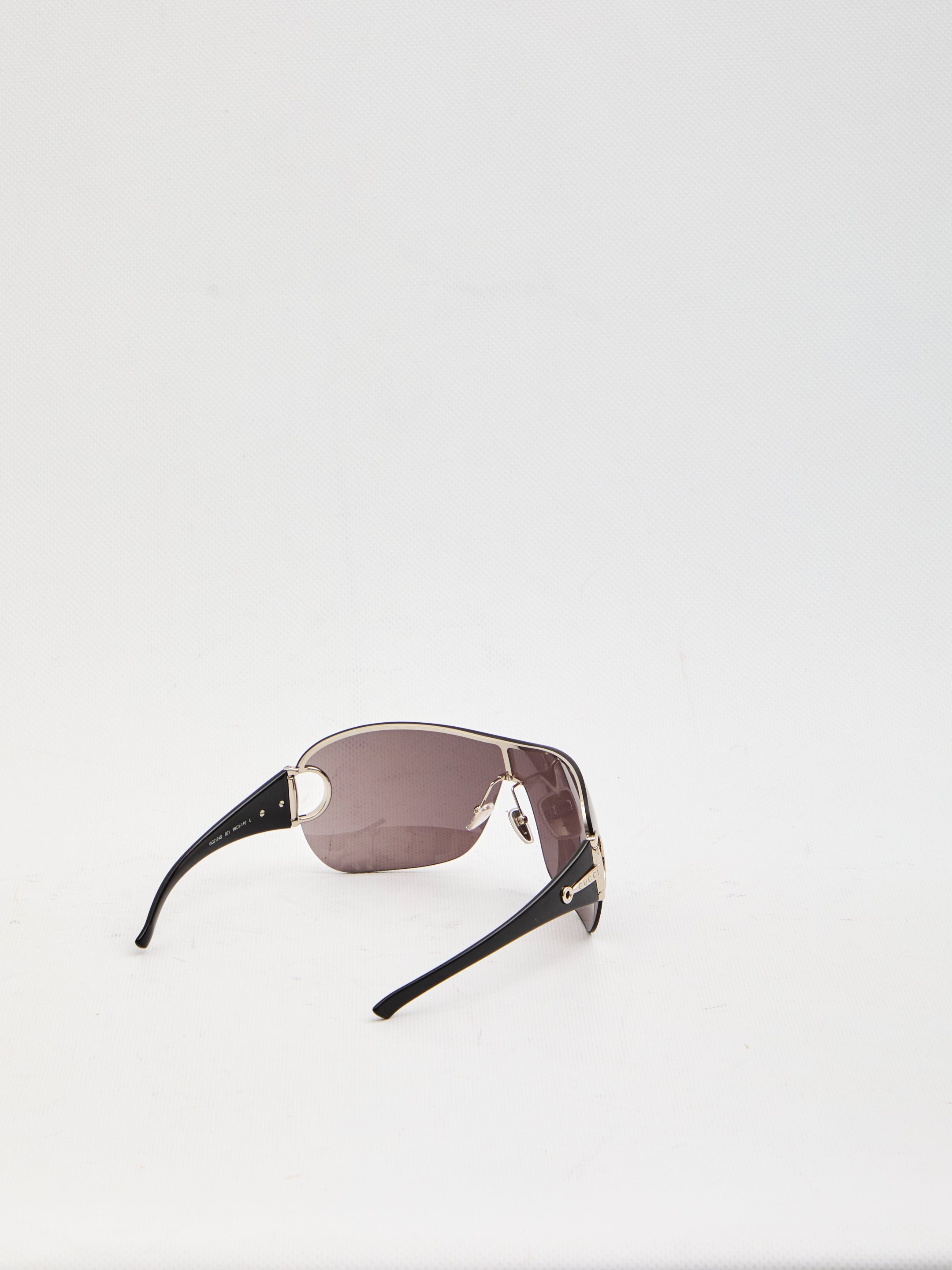 Silver frameless mask-style sunglasses. They feature gray frameless lenses, black injection temples with a cut-out metal half Morsetto detail. 100% UVA/UVB protection.