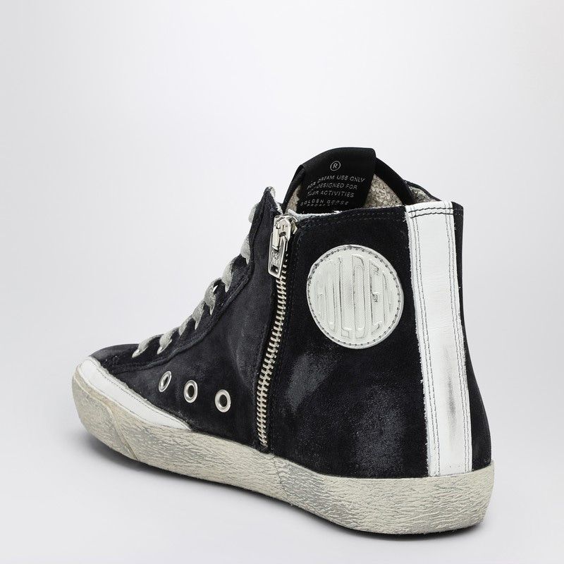 Elevate your sneaker game with these iconic Francy High-Top Sneakers from Golden Goose in midnight blue and white leather. These luxury sneakers feature the brand's signature distressed-effect design, a contrasting side star, and logo detailing on the tongue for that coveted lived-in aesthetic. The lace-up closure and convenient side zip ensure easy on-and-off wear, while the round toe and flat rubber sole provide all-day comfort. Perfect for adding an effortlessly cool edge to your casual wardrobe, these high-tops pair beautifully with everything from skinny jeans to flowing dresses. A true investment piece that combines Italian craftsmanship with street-style sophistication.