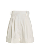 The high-waisted design is finished with a secure zip, hook-and-eye, and button closure, while practical pockets add functionality to the polished aesthetic. The turn-up hem detail adds a touch of casual sophistication, making these shorts incredibly versatile.