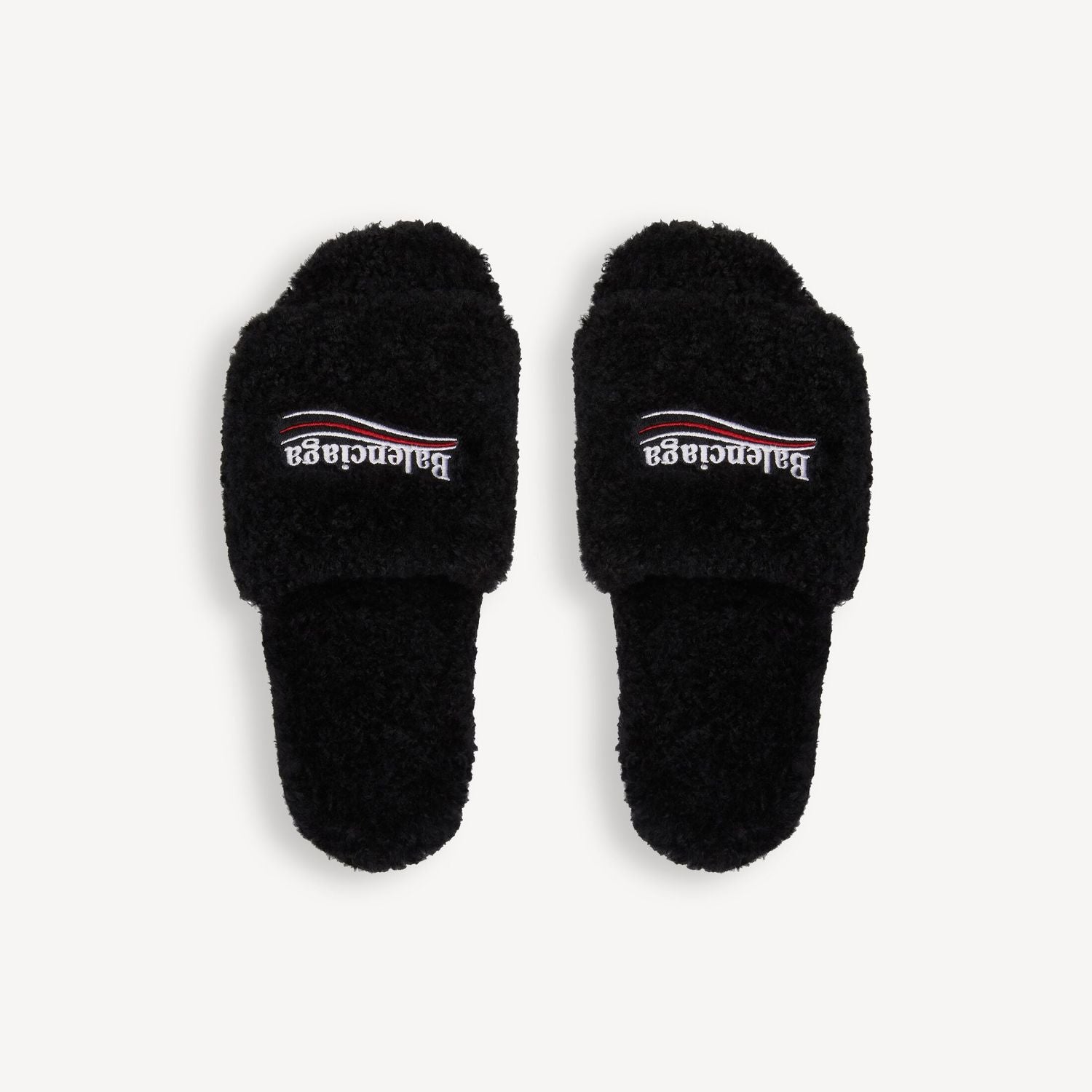 Indulge in luxurious comfort with these Balenciaga Furry Slides crafted from plush fake shearling. These cozy slides feature a soft, fuzzy upper strap that envelops your feet in cloud-like comfort, perfect for lounging at home or running casual errands in style.