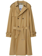 LONG TRENCH COAT IN BEIGE COTTON GABARDINE. IT FEATURES EPAULETTES, HOOK CLOSURE ON COLLAR, DOUBLE-BREASTED CLOSURE, DETACHABLE BELT WITH B-SHAPED BUCKLE, TWO SIDE WELT POCKETS, BELTED CUFFS AND BACK VENT. BURBERRY CHECK COTTON LINING WITH EQUESTRIAN KNIGHT DESIGN LABEL. RELAXED FIT.