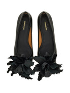 Introducing the GEMY by Ferragamo, a stunning pointed-toe flat that effortlessly combines sophistication with whimsical charm. This elegant black flat features an exquisite feather and floral embellishment at the toe, creating a striking focal point that elevates any ensemble.