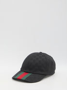 BLACK ORIGINAL GG FABRIC BASEBALL CAP. IT FEATURES A GREEN AND RED WEB RIBBON ON THE VISOR AND AN ADJUSTABLE REAR CLOSURE.