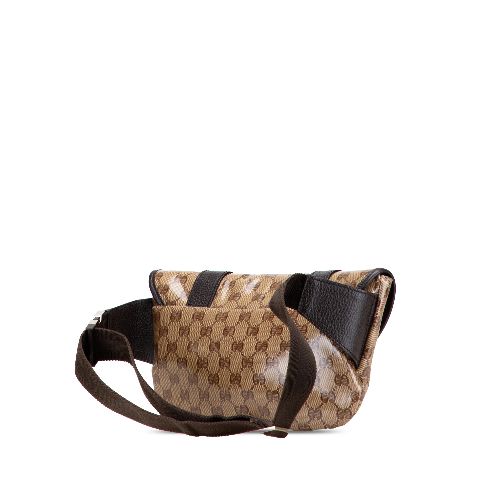 Elevate your hands-free style with this iconic Gucci GG Crystal Belt Bag. Crafted from the signature GG coated canvas with luxurious leather trim, this versatile accessory features an adjustable flat waist strap for a customized fit. The practical flap closure with touch fasteners keeps your essentials secure, while the interior zip pocket provides organized storage for your valuables.
