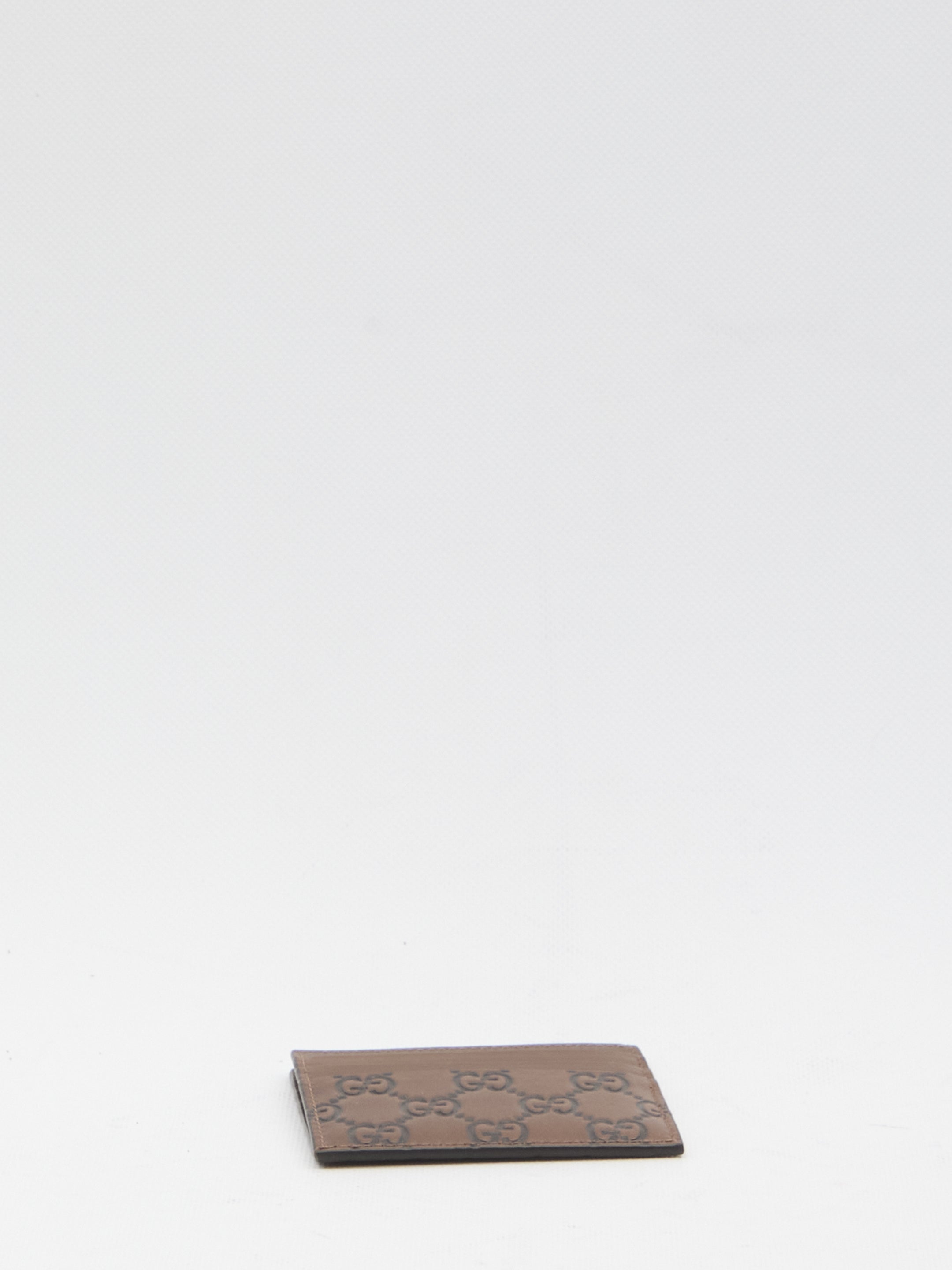 LEATHER CARD HOLDER WITH EMBOSSED GG IN BROWN AND BLACK. IT FEATURES SIX CARD SLOTS AND ONE CENTRAL OPEN POCKET. ANY IMPERFECTIONS IN THE LEATHER SHOULD NOT BE CONSIDERED MANUFACTURING DEFECTS, BUT RATHER A CHARACTERISTIC OF THE MATERIAL.