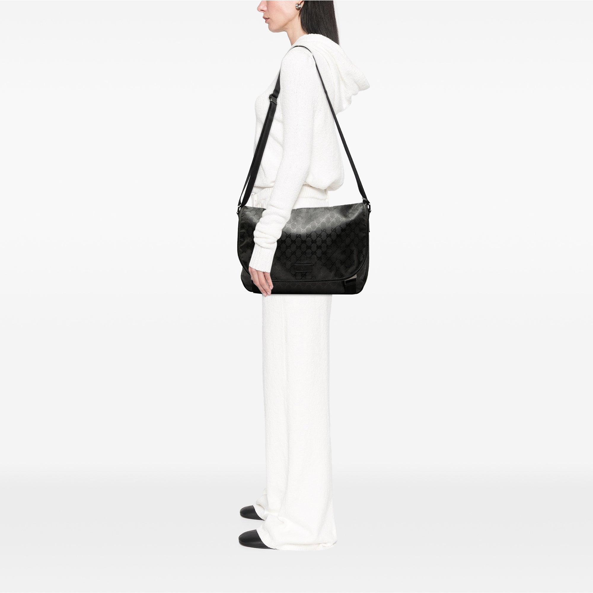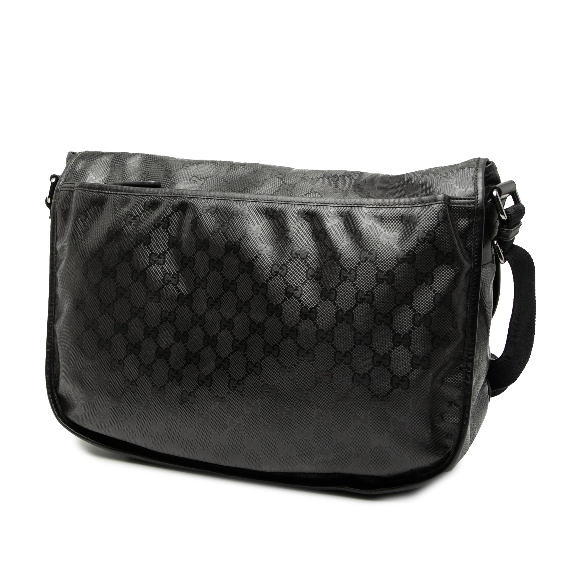 This crossbody bag features a coated canvas body with leather trim, an adjustable flat strap, a top flap with dual buckle closures, and interior zip and slip pockets.