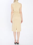 Beige silk jacquard dress. Features a scarf collar with integrated tie detail, elasticated waistband with a personalized metal plaque, back zip closure, and a center back slit. Sleeveless design. Regular fit.