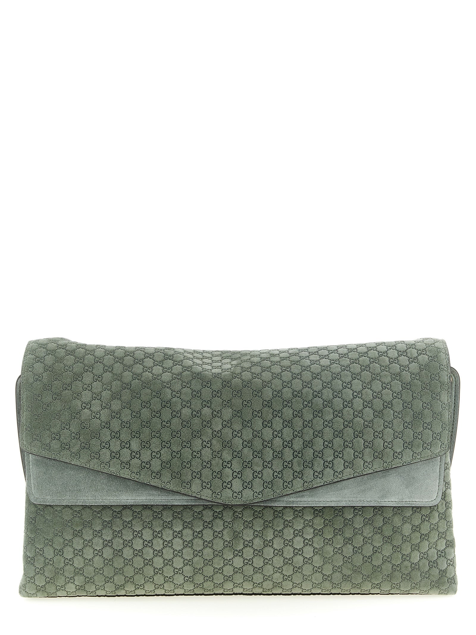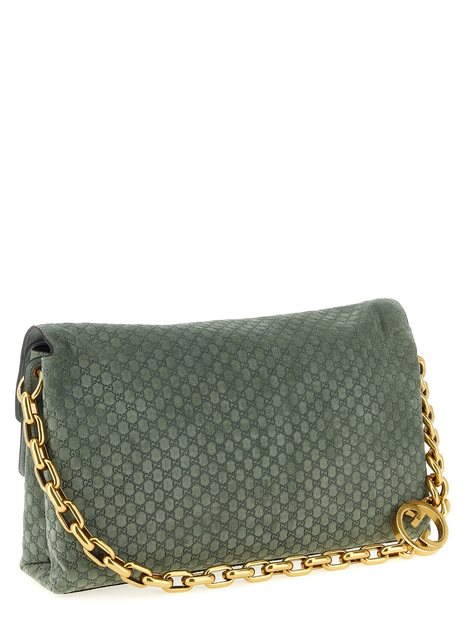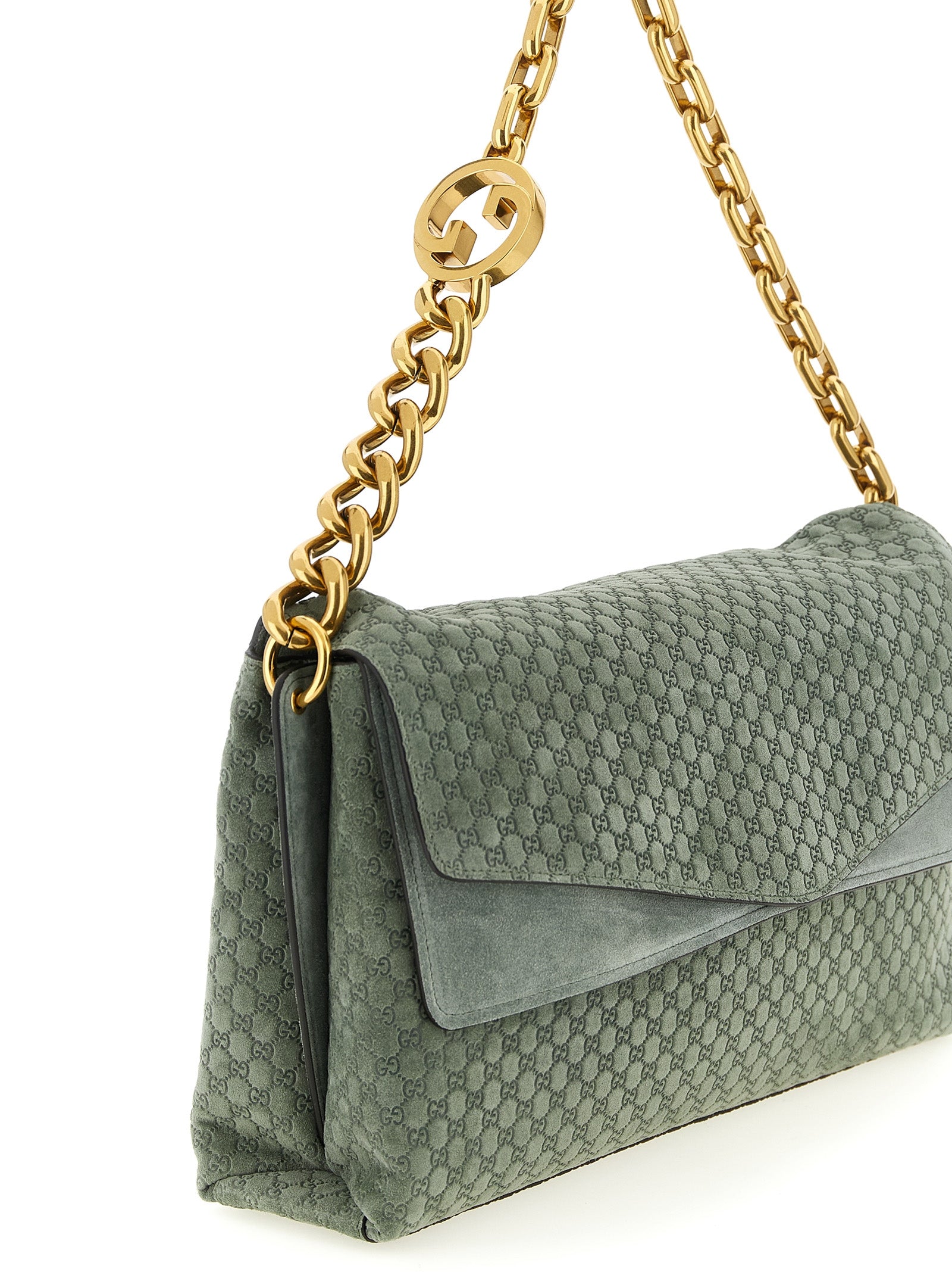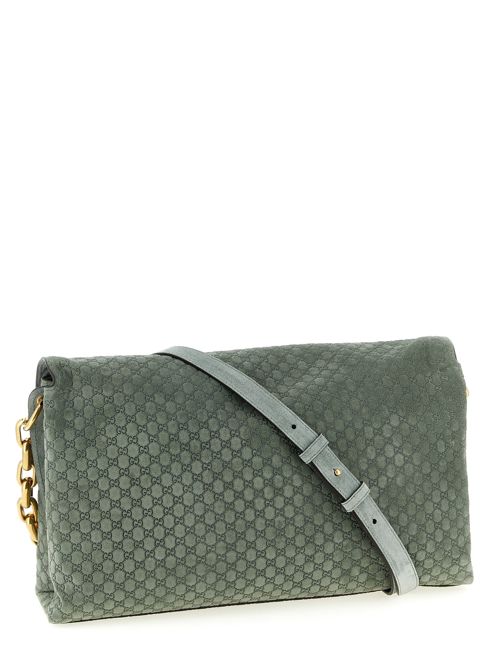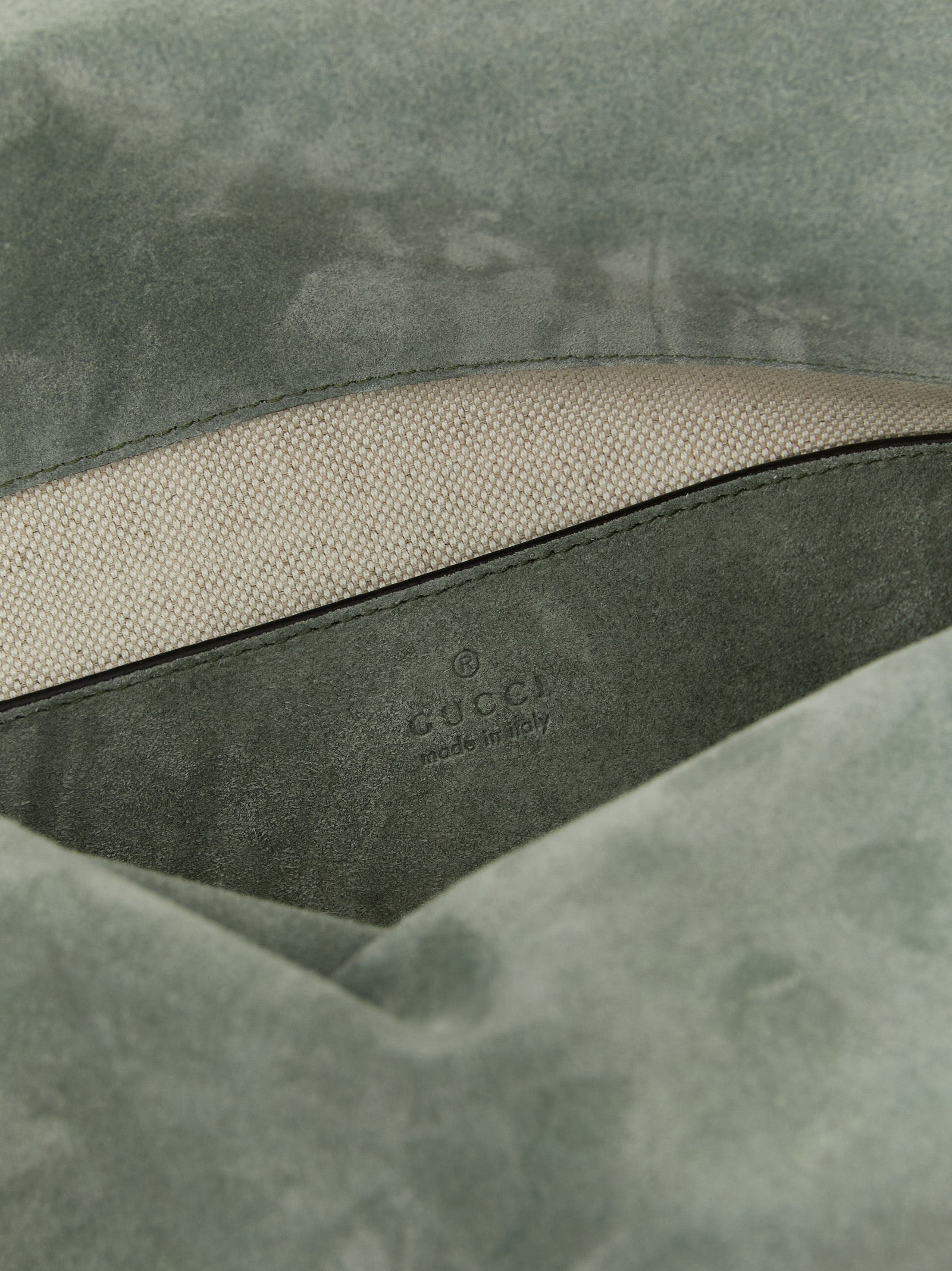 Elevate your everyday style with this exquisite Gucci GG large suede shoulder bag in a sophisticated sage green hue. Crafted from luxurious suede with the iconic embossed GG monogram, this versatile piece features a two-bellows construction for ample storage and a magnetic flap closure for easy access.