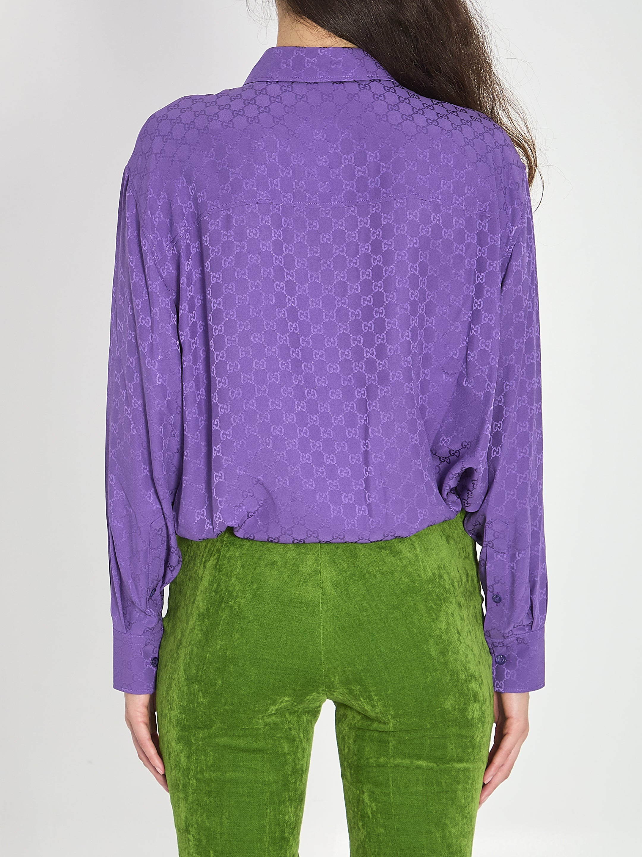 Purple silk shirt. It features long sleeves, a pointed collar, a front button closure, and buttoned cuffs. Soft fit.