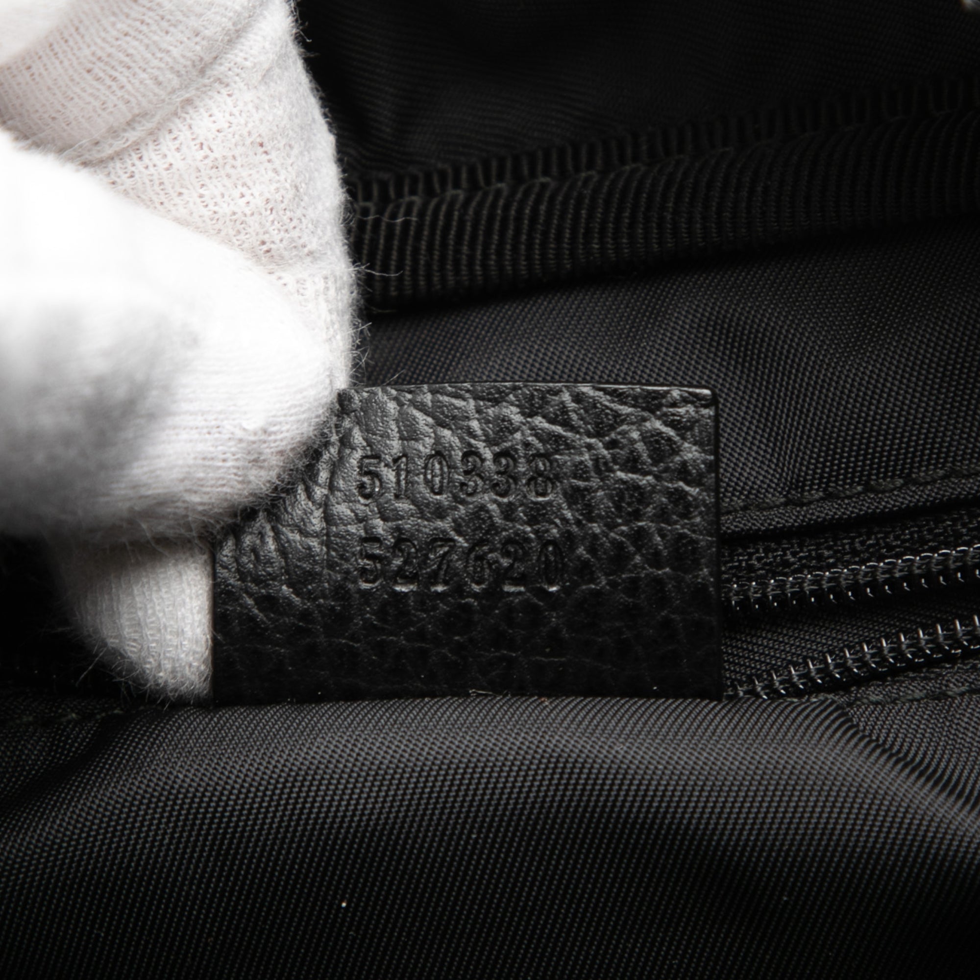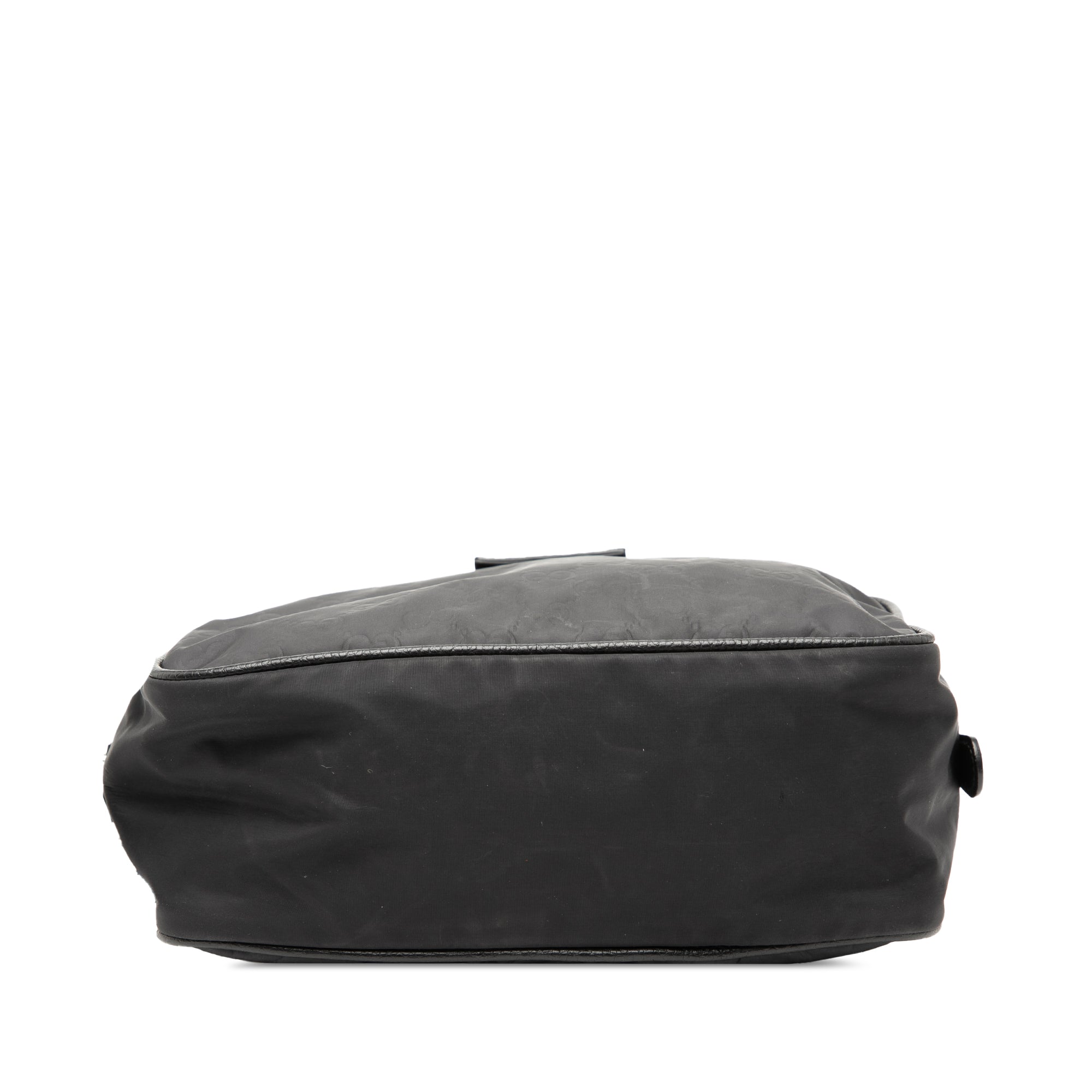 This pouch features a nylon body with leather trim, a flat leather side handle, a top zip closure, and an interior zip pocket.