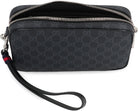 POUCH IN BLACK GG SUPREME CANVAS WITH BLACK LEATHER TRIM. IT FEATURES A DETACHABLE WRIST STRAP WITH BLUE AND RED WEB STRIPE, ZIPPER CLOSURE, ONE MAIN INTERIOR COMPARTMENT AND ONE INTERNAL ZIP POCKET. DUST BAG INCLUDED. ANY LEATHER IMPERFECTIONS ARE NOT TO BE CONSIDERED MANUFACTURING DEFECTS, BUT A PECULIARITY OF THE MATERIAL.