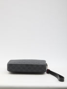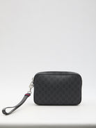 Pouch in black GG Supreme canvas with black leather trim. It features a detachable wrist strap with blue and red Web stripe, zipper closure, one main interior compartment and one internal zip pocket. Dust bag included. Any leather imperfections are not to be considered manufacturing defects, but a peculiarity of the material.