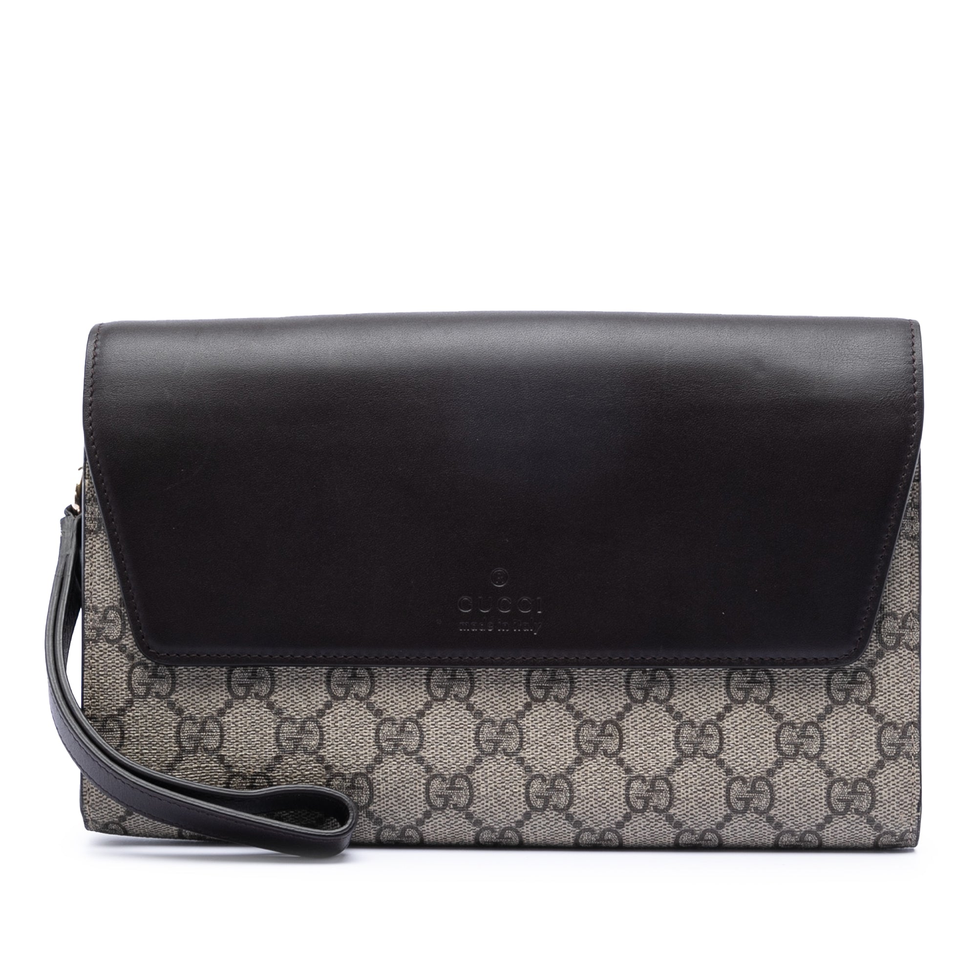 This clutch bag features a coated canvas body with leather trim. a flat leather wrist strap, a top flap with snap closure, interior zip and slip compartments, and interior card slots.