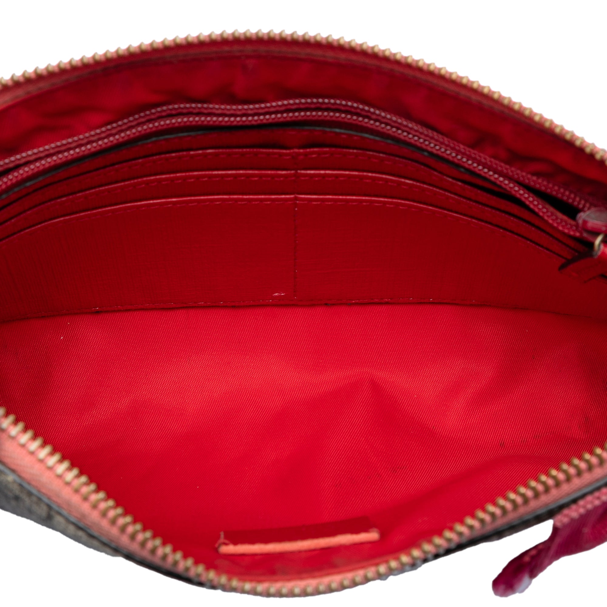 Exterior Back stained with Other. Exterior Corners Worn. Embellishment Scratched. Exterior Front stained with Other. Exterior Handle Worn. Exterior Handle stained with Other. Interior Lining Worn. Interior Lining stained with Other. Practical Attachment Scratched. Exterior Side stained with Other. Exterior Top Worn. Exterior Top stained with Other. Zipper Scratched.