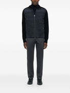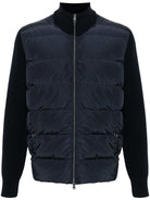 This sophisticated Herno quilted jacket combines the warmth of a puffer vest with the comfort of knit sleeves for the perfect hybrid outerwear piece. The navy quilted body features premium insulation while the black knit sleeves and collar provide flexibility and style.