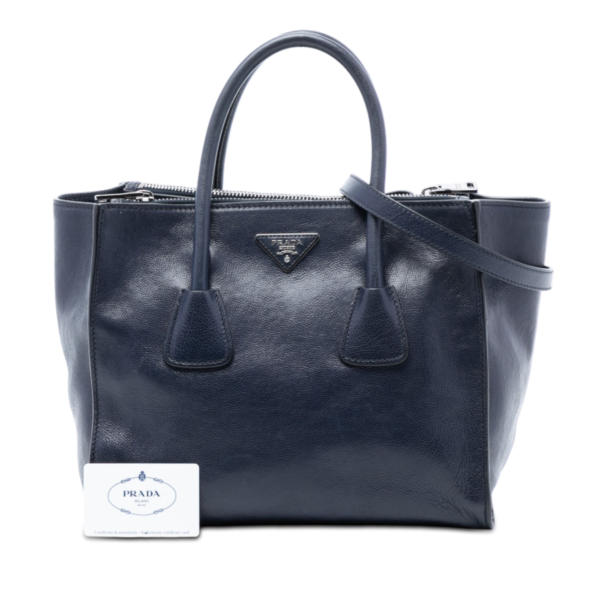 The Twin Pocket satchel features a calf leather body, rolled leather handles, a detachable flat leather strap, an open top with a magnetic closure, top zip compartments, and interior zip and slip pockets.