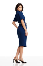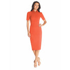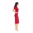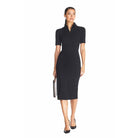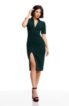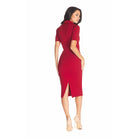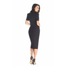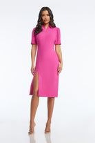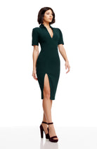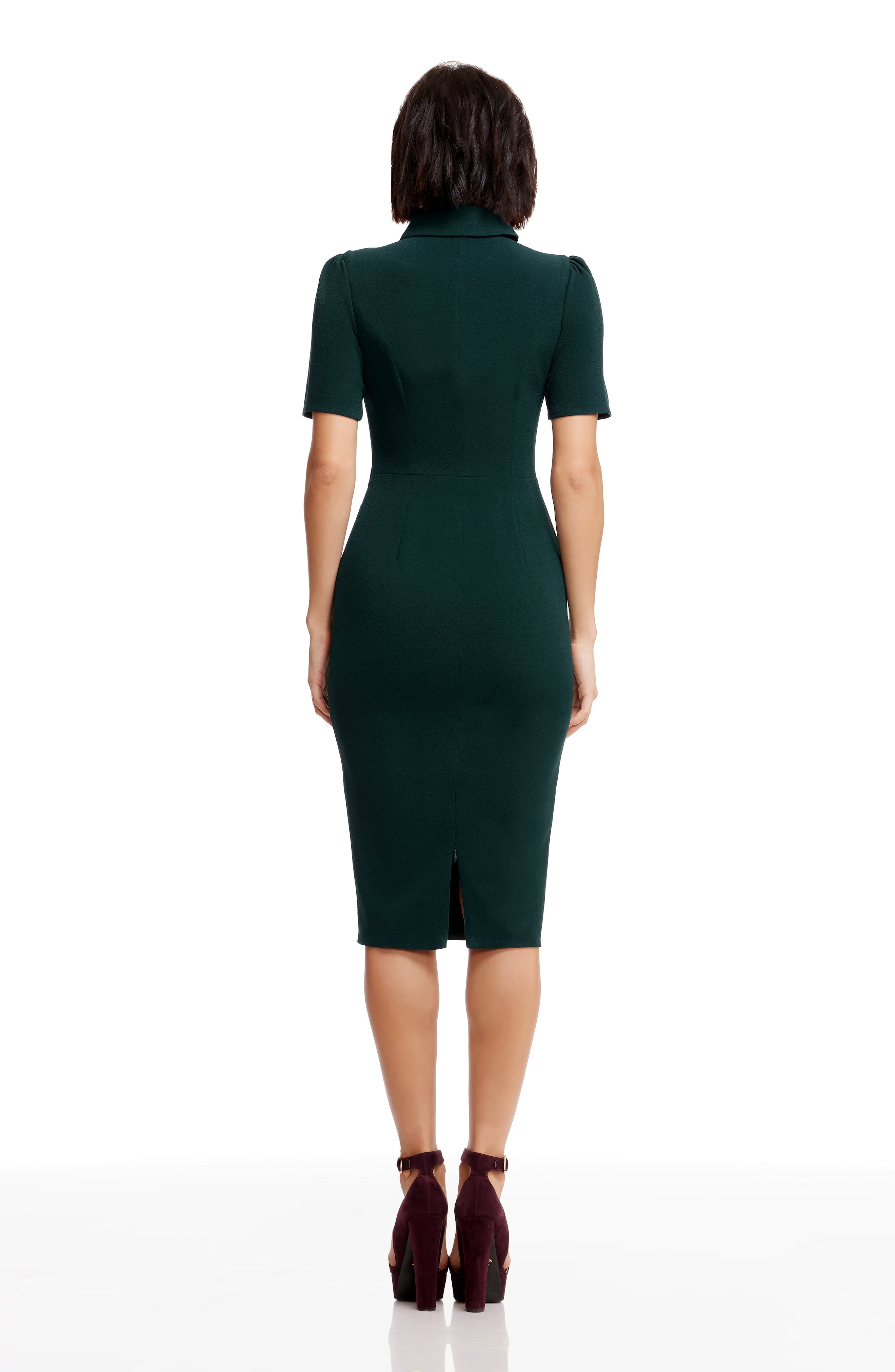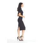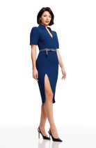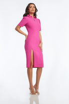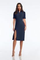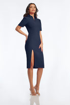 The Gloria midi dress is fully lined, does not stretch, and is made from a heavy, textured fabric. It features a zip neckline and two zip slits (one at the back and one at the leg) that allow you to fully customize your look.
