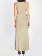 GOLD LUREX DRESS. FEATURES A HIGH NECKLINE AND A FRONT SLIT WITH BUTTONS. SLEEVELESS DESIGN. MADE FROM STRETCH FABRIC. REGULAR FIT.