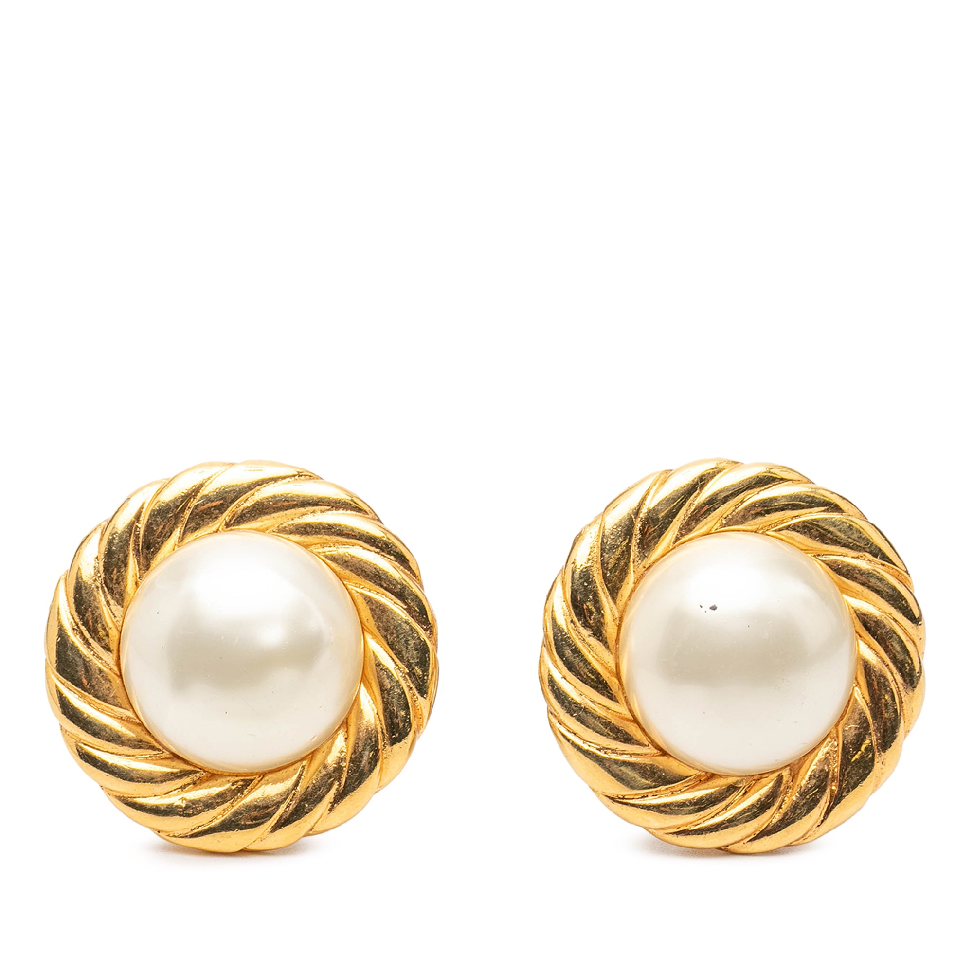These earrings feature a gold tone metal body and faux pearl detail, and clip on closures.